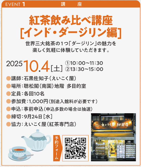 紅茶飲み比べ講座 [インド・ダージリン編] 2025年10月7日 最終更新日時 : 2025年10月9日 eikokuya_master 名古屋市千種区の揚輝荘で10月4日(土)紅茶飲み比べ講座 [インド・ダージリン編]が催されました。 FacebookX