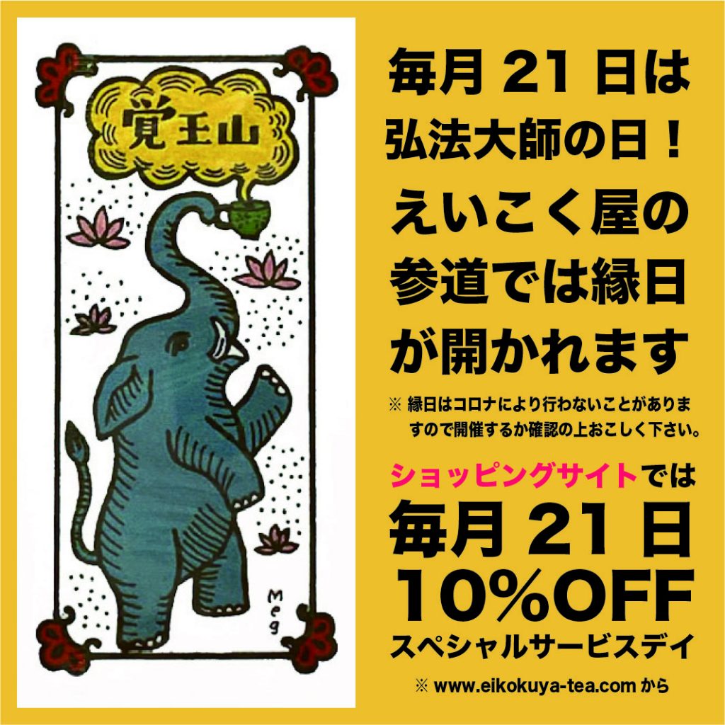 えいこく屋のある覚王山では、毎月21日が弘法大師の日として日泰寺の縁日が開催されています。この縁日に合わせ、ショッピングサイトでも毎月21日を10%offのスペシャルサービスデイとさせていただきます。